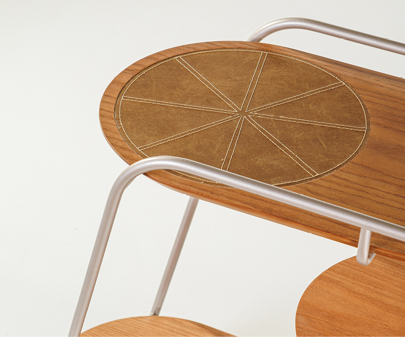 Prateleiras em MDF revestido com lâmina de madeira natural. Acabamento em verniz PU fosco. Detalhe em recouro.
